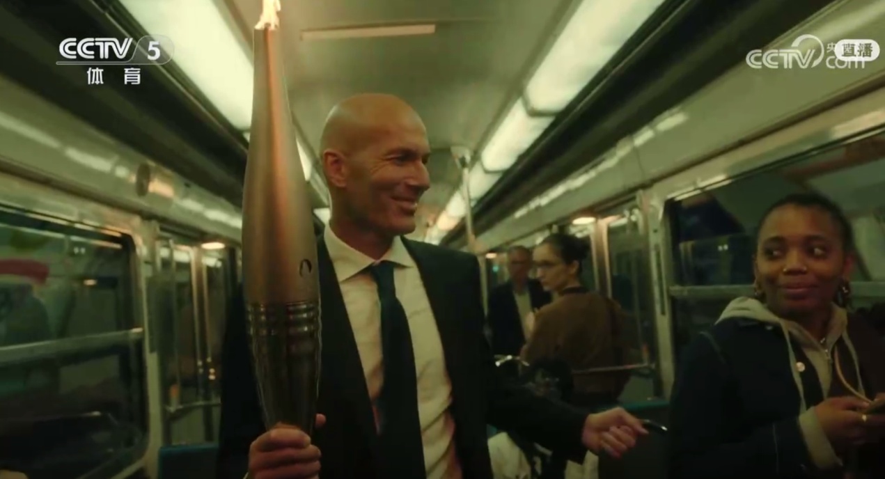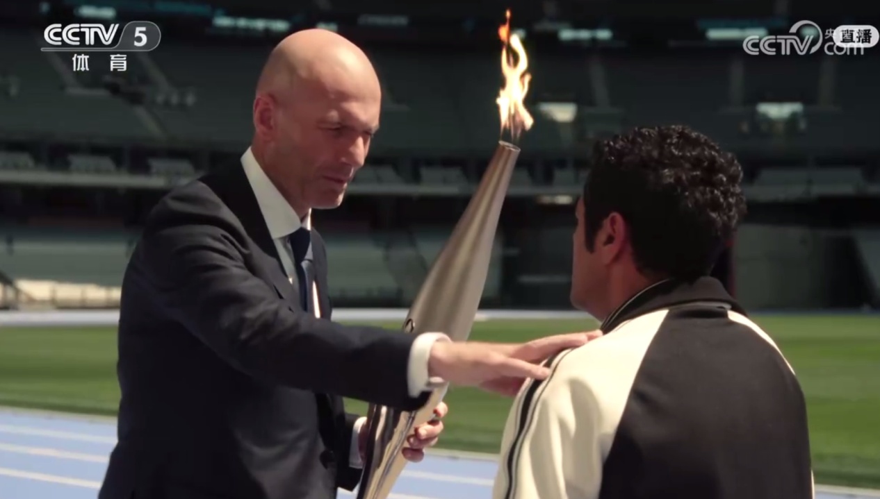 齐达内运送奥运火炬交给神秘火炬手