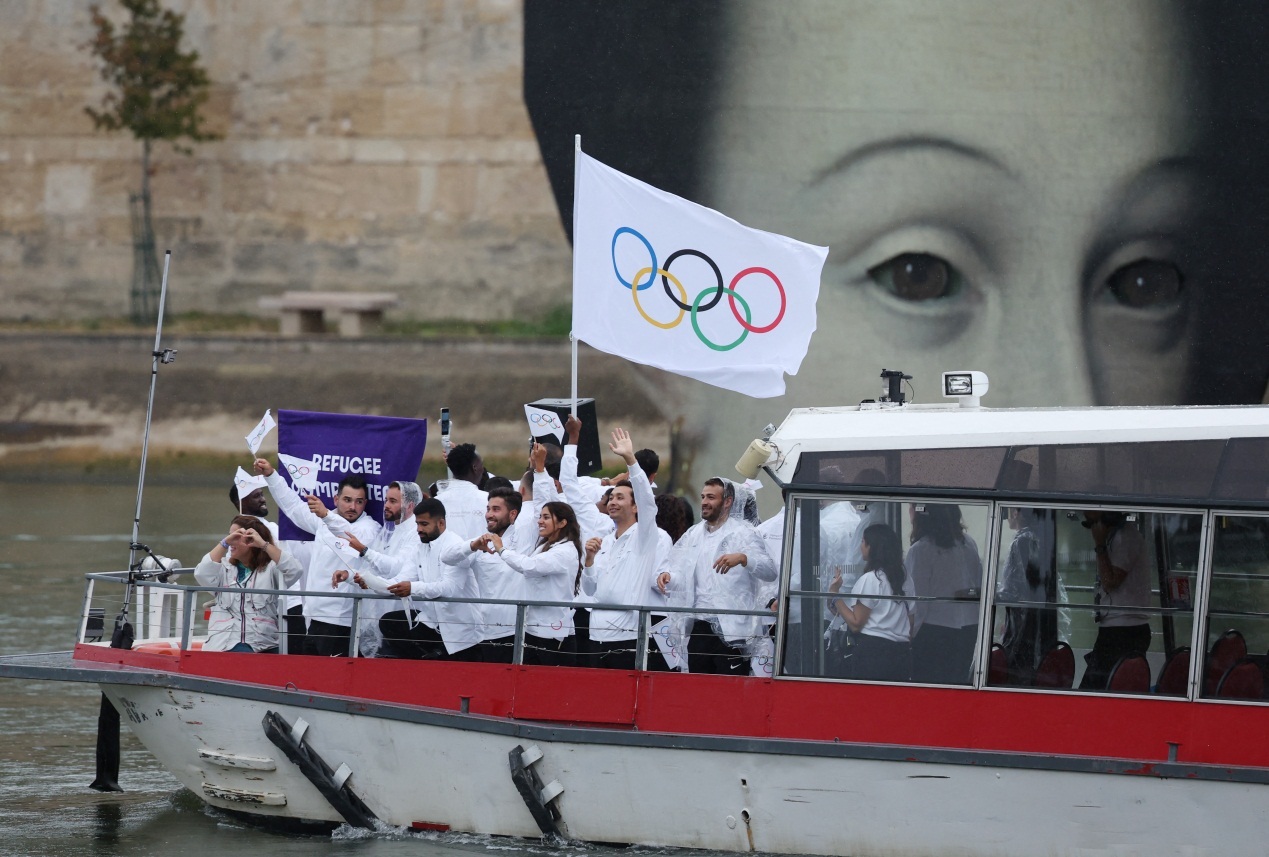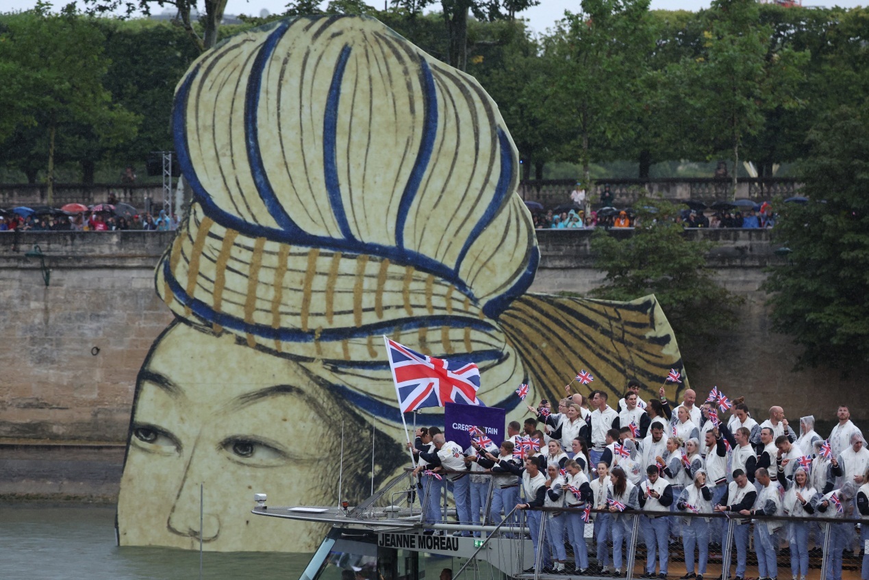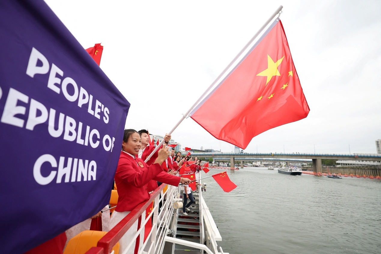 乒乓球运动员马龙和花样游泳运动员冯雨担任旗手,中国体育代表团运动员手举国旗,乘坐游船在塞纳河巡游。