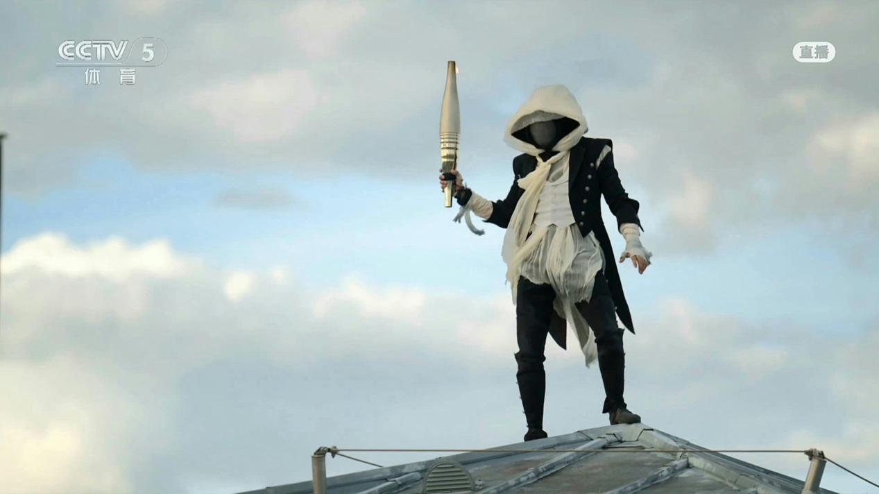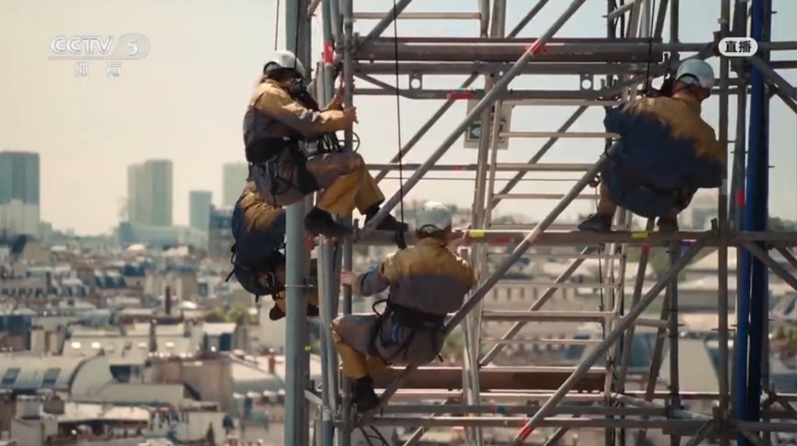 20名舞者在脚手架上舞蹈,火炬手降落在巴黎圣母院的脚下。巴黎圣母院是世界文化遗产,2019年失火后,目前正在修缮过程当中,预计于今年12月再度对公众开放。