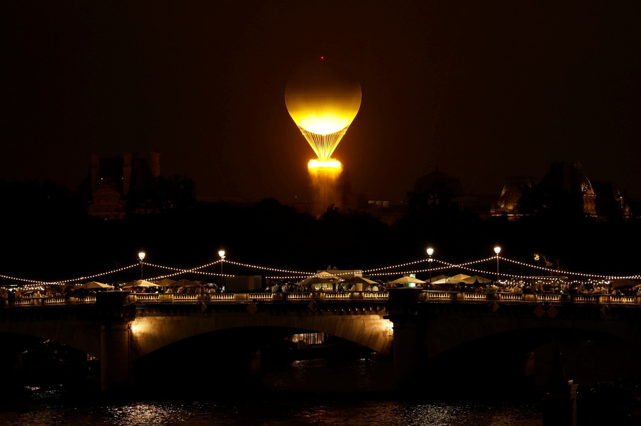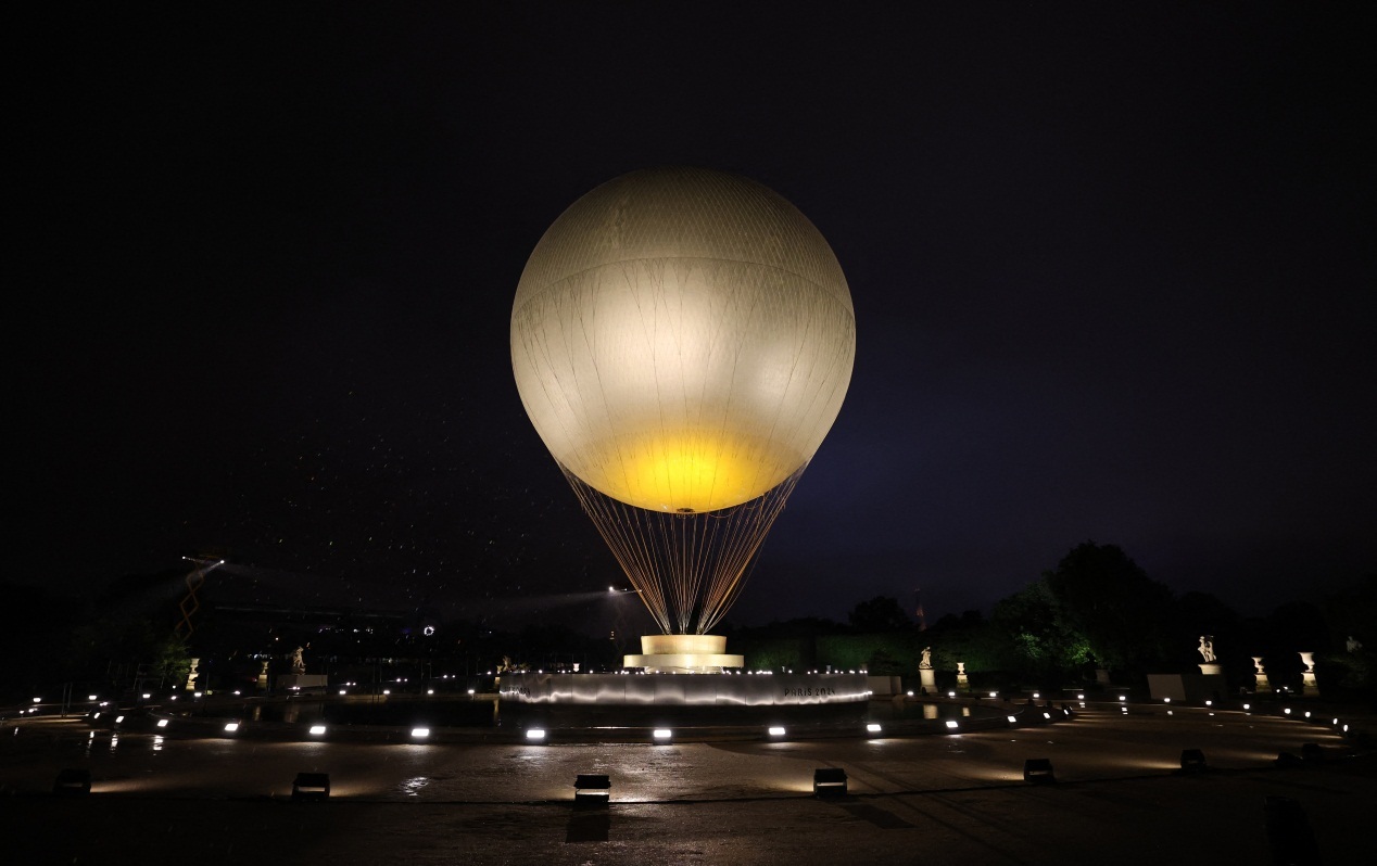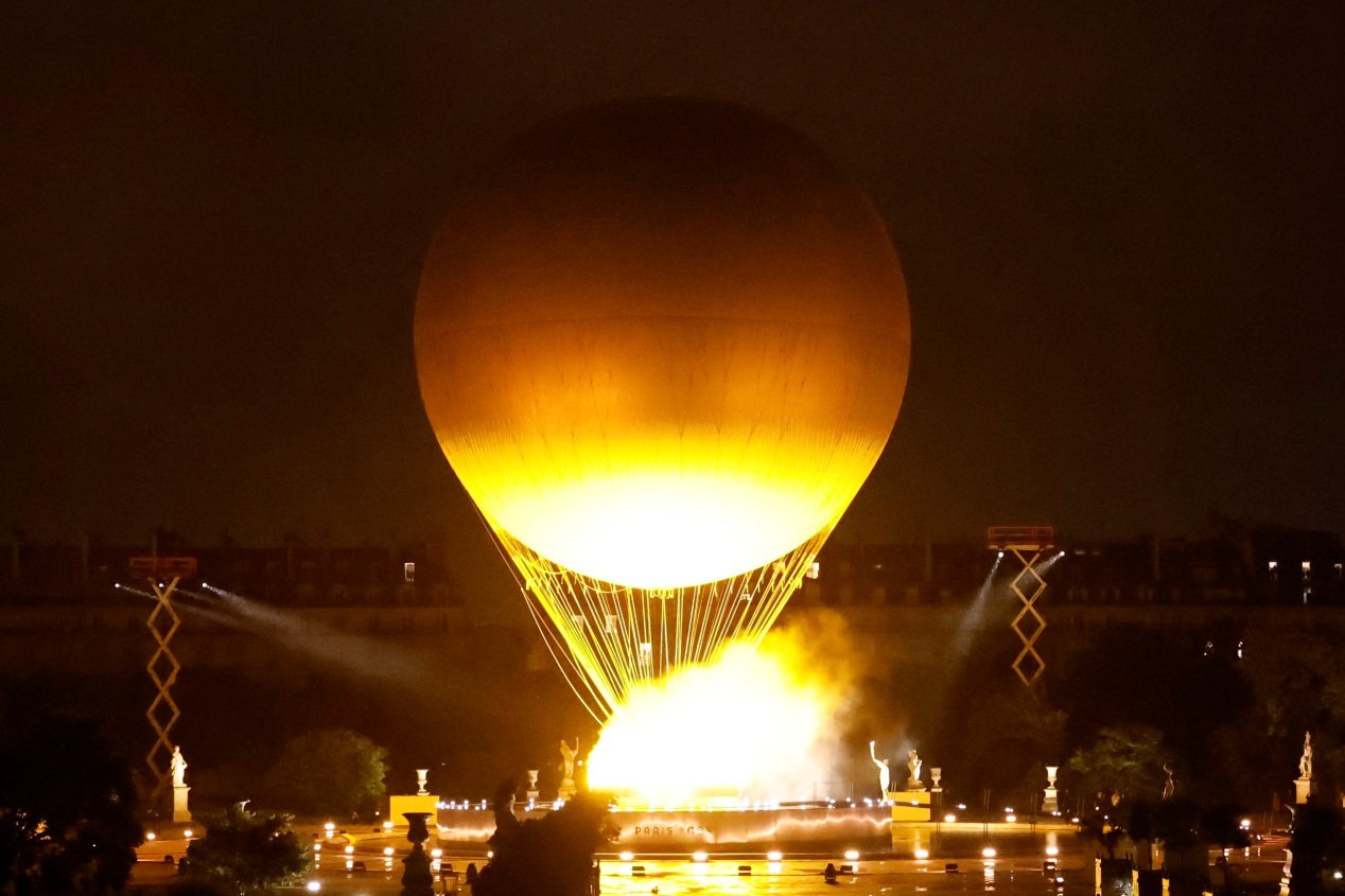 神秘火炬手将火炬交给法国传奇球星齐达内,随后火炬手们依次传递。火炬传递最后来到一个热气球前。这个热气球高30米,直径22米,底部的筐直径7米。这个热气球就是巴黎奥运火炬台。最后两名火炬手一起将奥运主火炬点燃,热气球腾空而起。