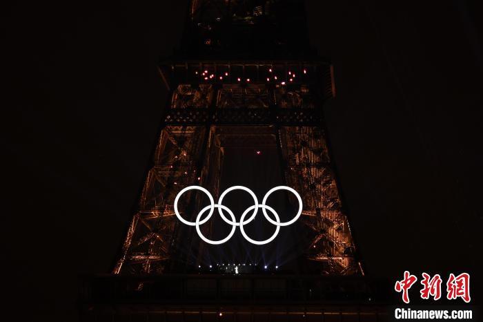 当地时间7月26日,第三十三届夏季奥林匹克运动会开幕式在法国巴黎举行。图为埃菲尔铁塔与五环标志。 中新社记者 盛佳鹏 摄