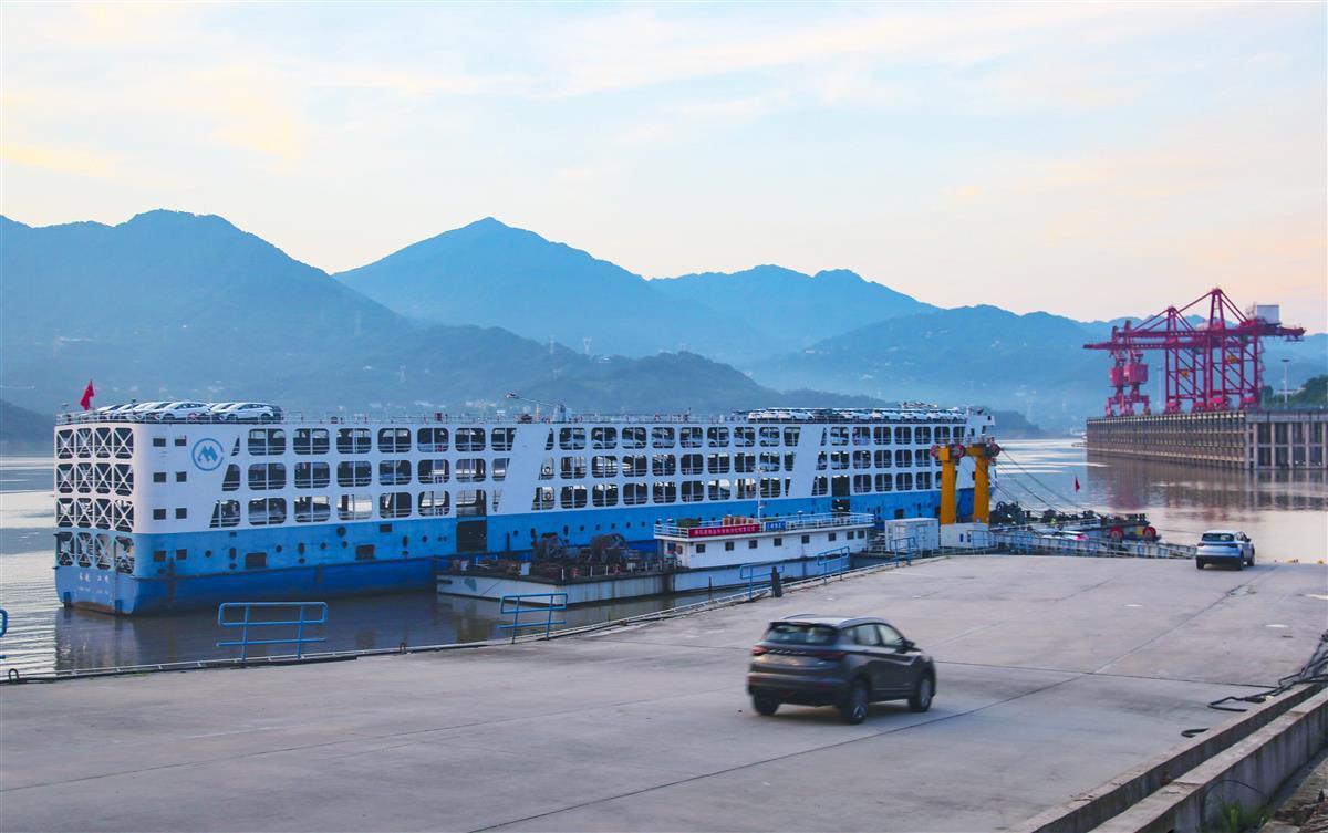 7月25日18时28分,在湖北宜昌秭归港商品车滚装泊位,“长航江耀”号商品车滚装船安全靠泊。经轿运车通过江南翻坝高速转运后的39台商品车,紧密依次停放在秭归港商品车停车场。紧接着,39台商品车安全有序开行上船、停靠在指定车位。