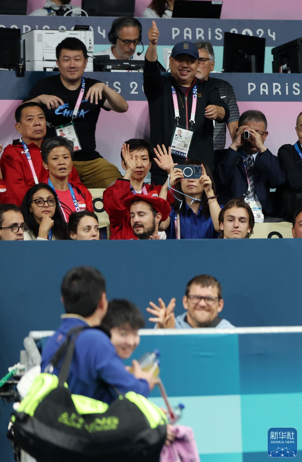 ↑中国乒乓球协会主席刘国梁为孙颖莎竖起大拇指。新华社记者 王东震 摄