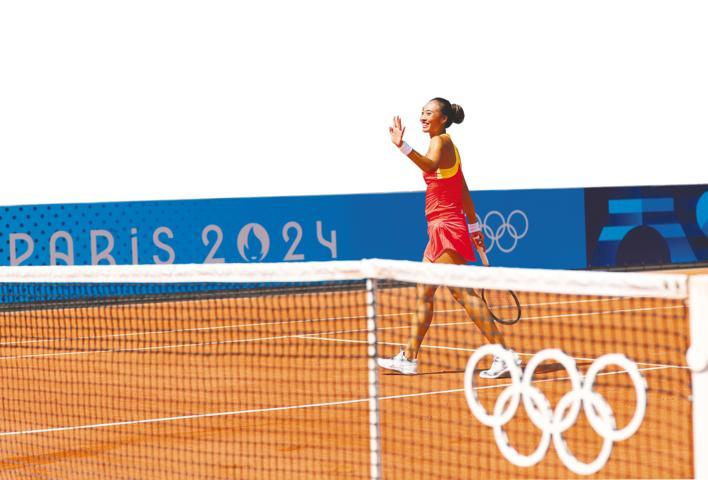 7月28日,中国选手郑钦文庆祝胜利。(新华社发)