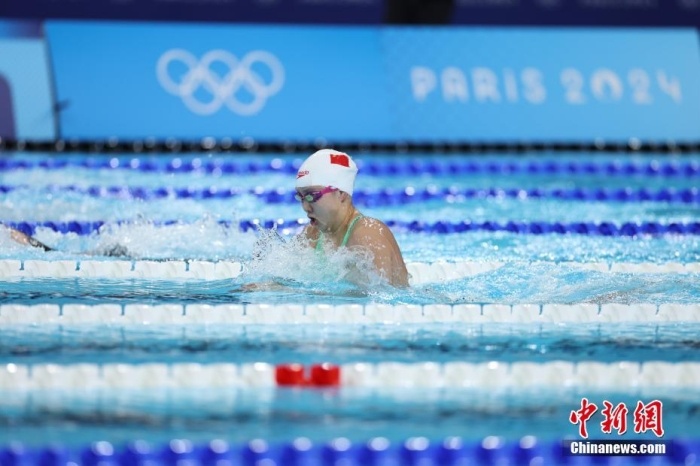 当地时间7月28日,在巴黎奥运会游泳女子100米蛙泳半决赛中,中国选手唐钱婷以1分05秒83的成绩排名小组第一,晋级决赛。图为唐钱婷在比赛中。中新社记者 富田 摄