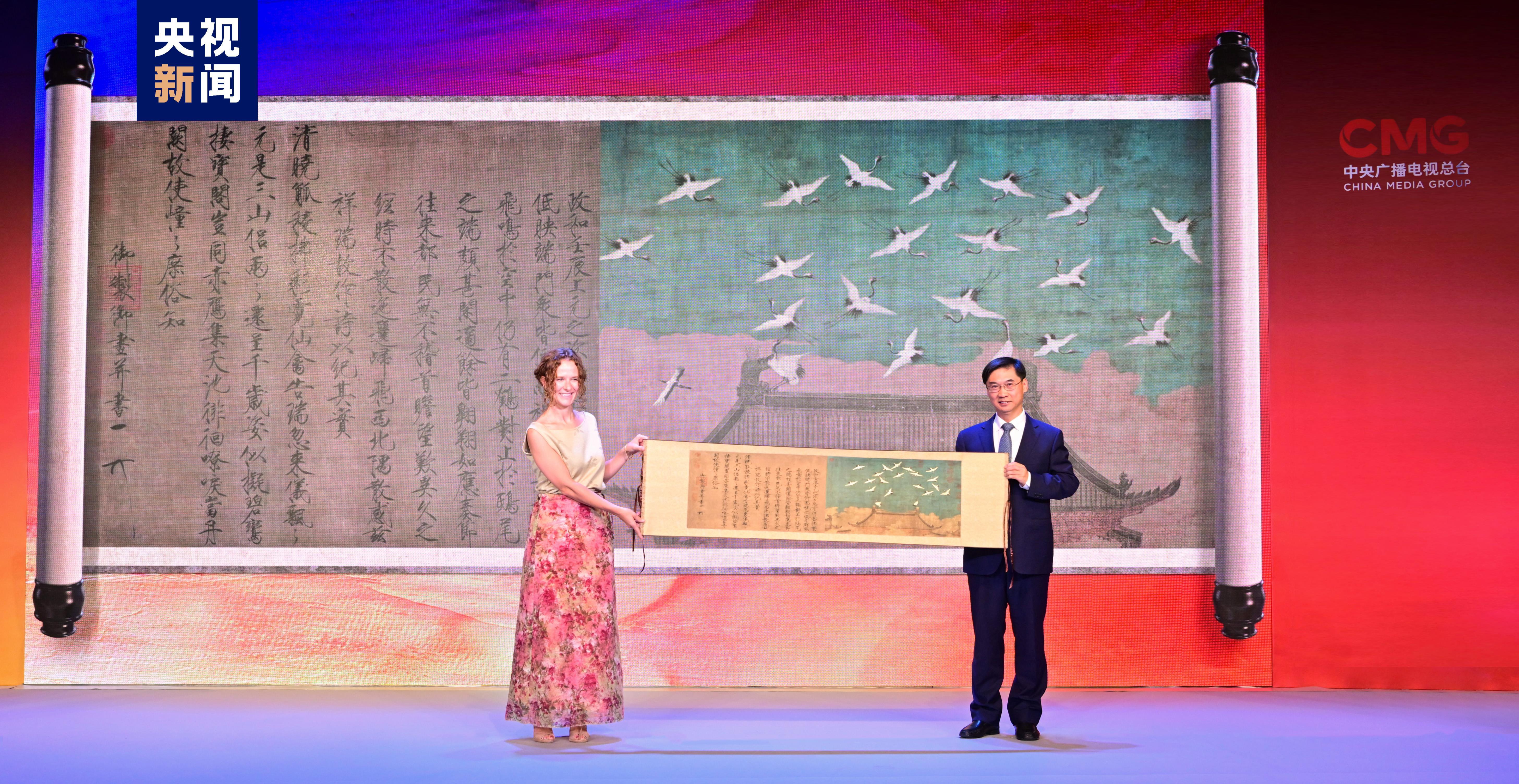 △中央广播电视总台编务会议成员兼国际交流局局长齐竹泉与西班牙豪尔赫·兰多博物馆馆长迪耶斯共同启动“CGTN艺术推广计划”《千年调·宋画》数字特展