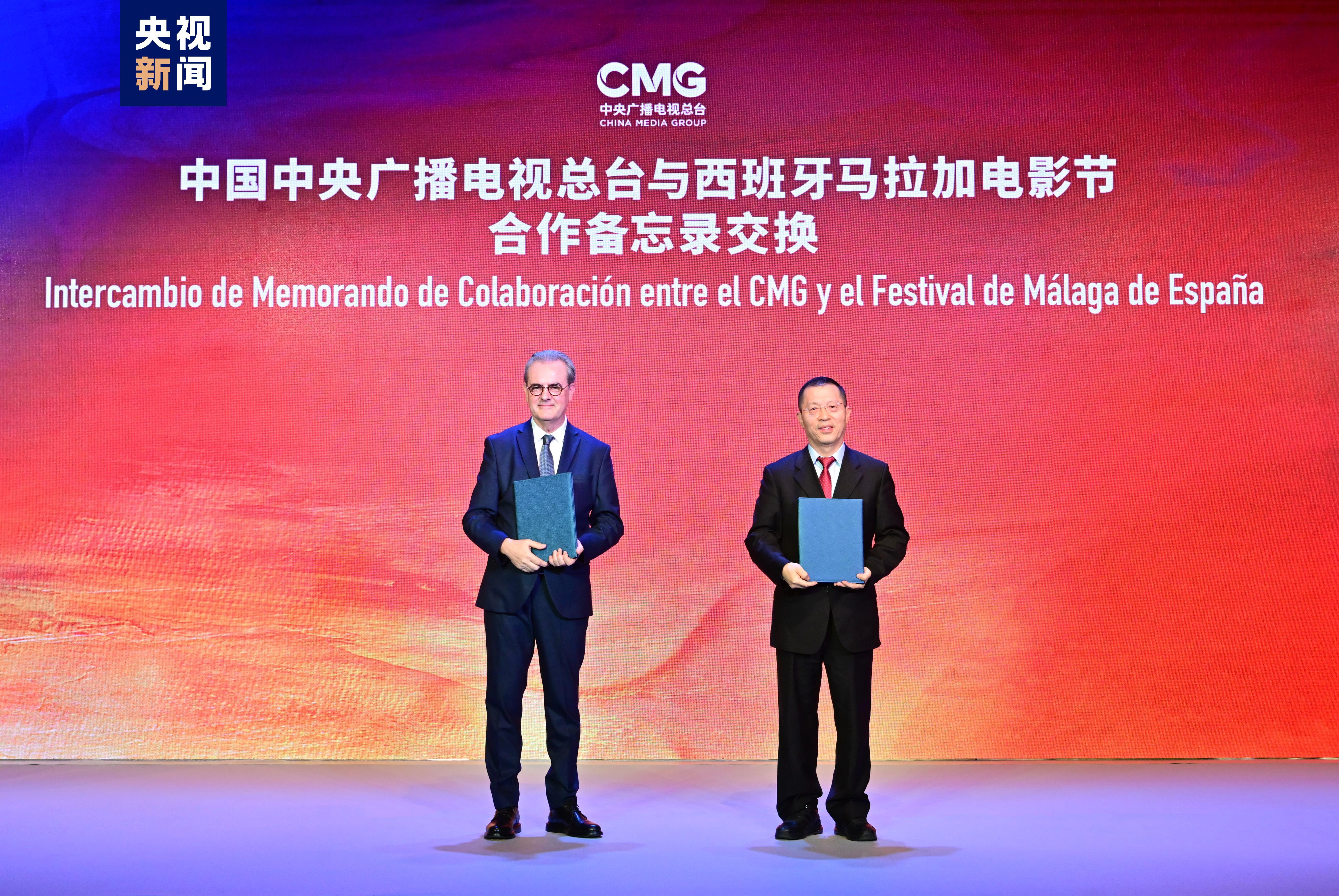 △中央广播电视总台总编室主任梁建增与西班牙马拉加电影节主席维加尔代表双方交换合作备忘录