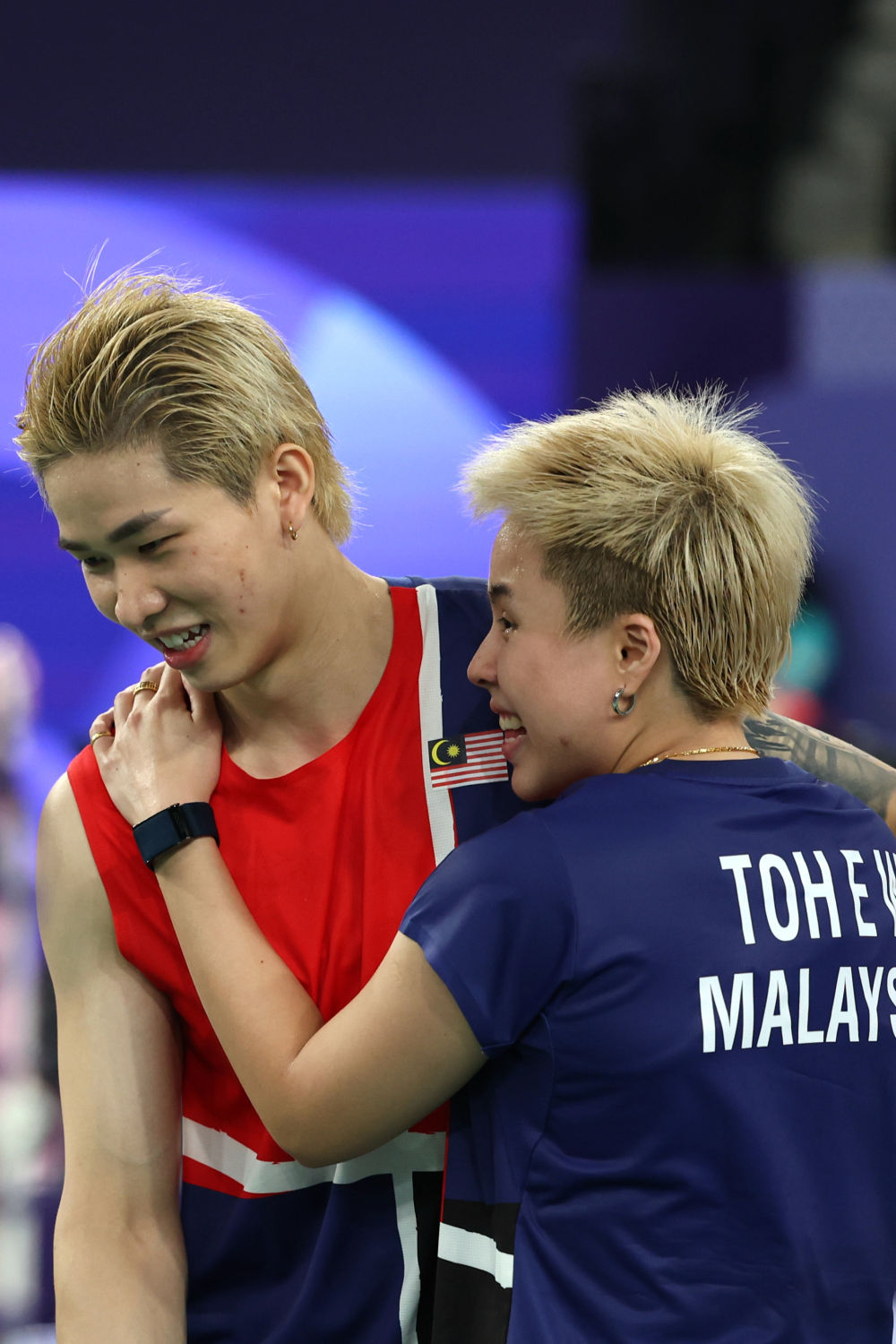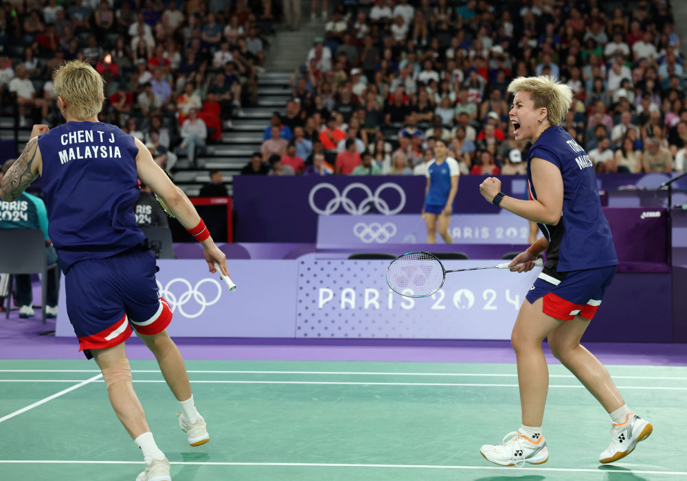 ↑马来西亚组合陈堂杰(左)/杜颐沩在比赛中庆祝得分。