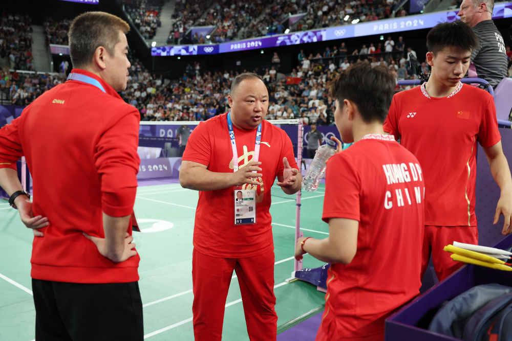 ↑中国组合冯彦哲(右一)/黄东萍(右二)在比赛间隙接受中国羽毛球协会主席张军(左二)的指导。