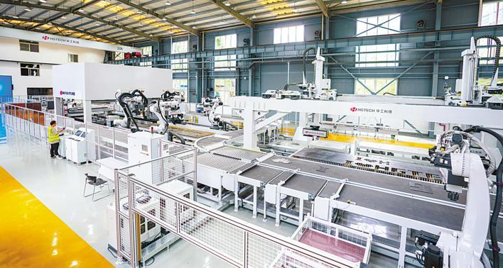 7月19日,华工科技中央研究院中试基地,全流程柔性智能备料中心投入中试验证使用,巨大的机器手灵巧地抓取钢板进行激光切割加工、传递上下料产线演示。
