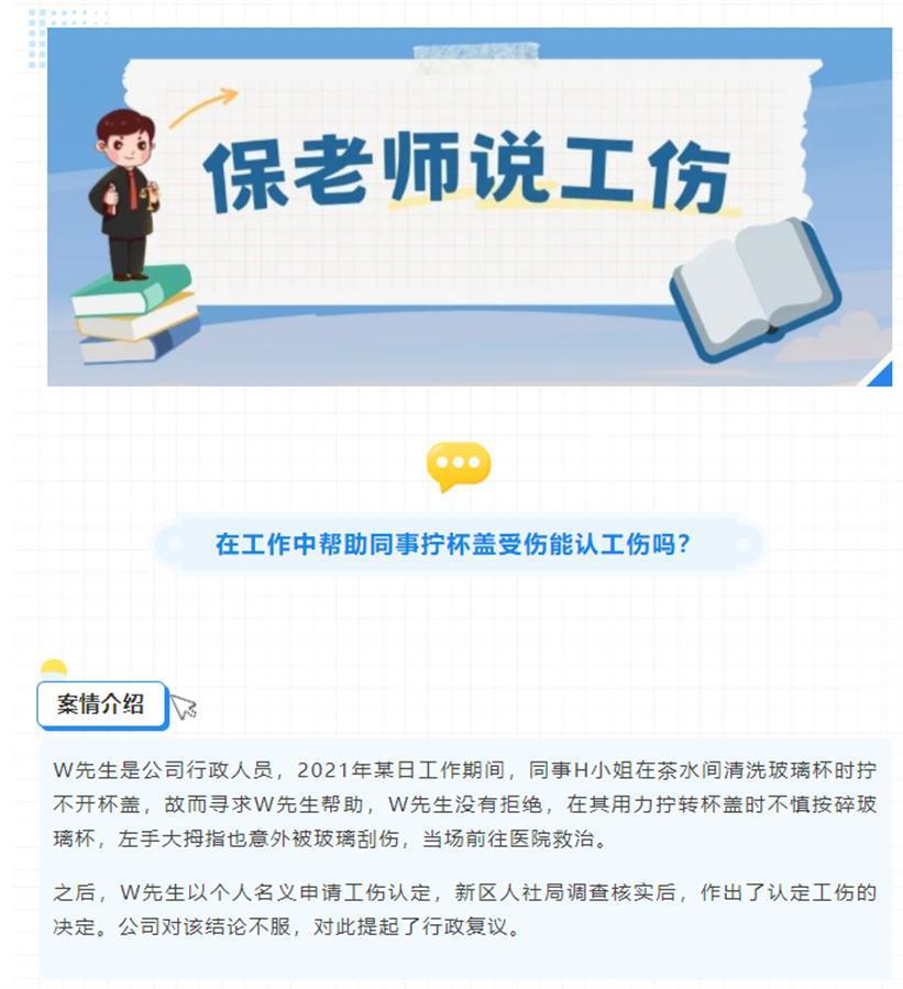 员工帮同事拧杯盖时,不小心被玻璃割伤手指,这种情况能算工伤吗?公司:受伤与工作无关,不算!上海浦东新区人社局却说:算!本案经过行政复议审查,决定维持上海浦东新区人社局认定工伤的决定。审查认为,W先生在工作中因帮助同事拧开杯盖而不慎受伤,属于因工作原因受伤,上海浦东新区人社局作出认定工伤的决定并无不当。近日,浦东人社局公布了这起案例。(据7月29日环球时报报道)