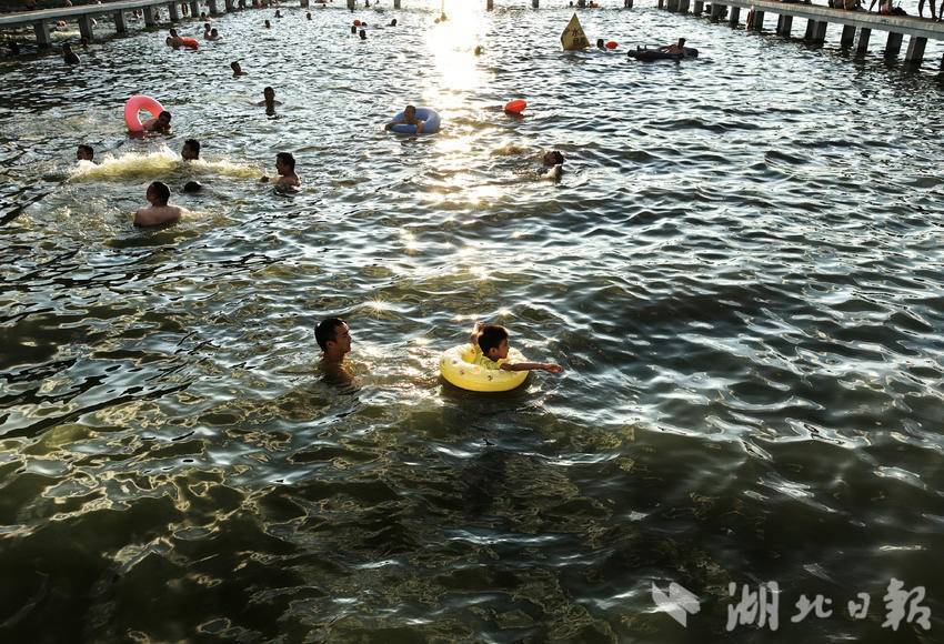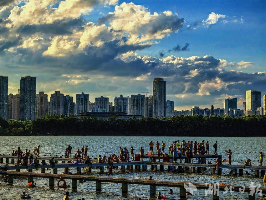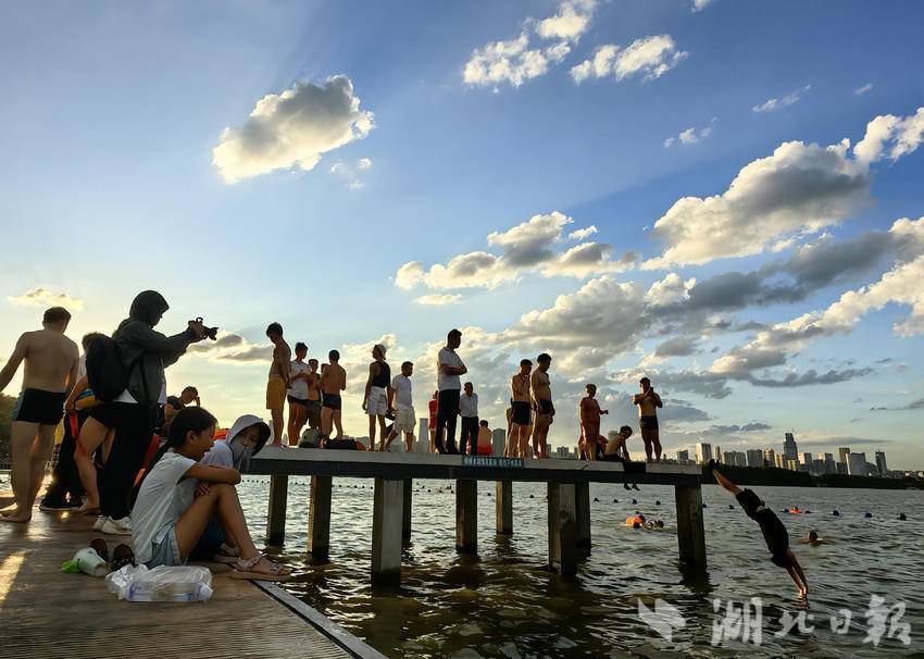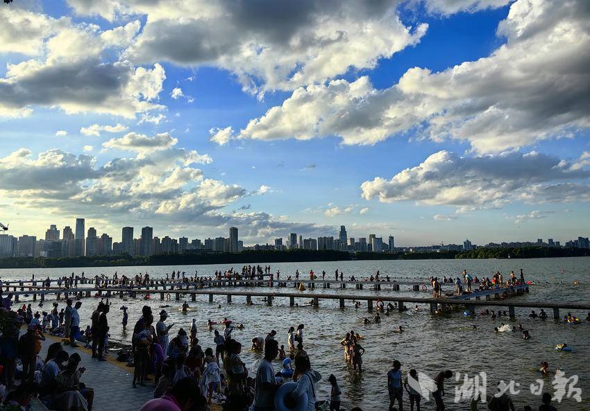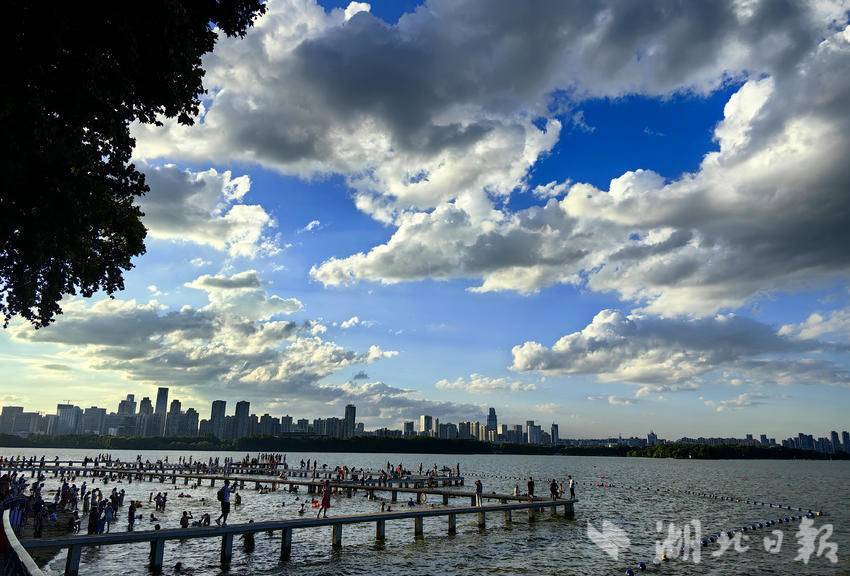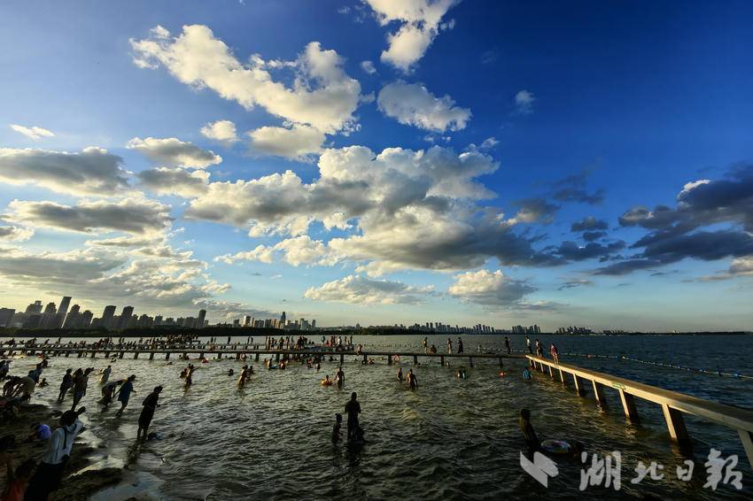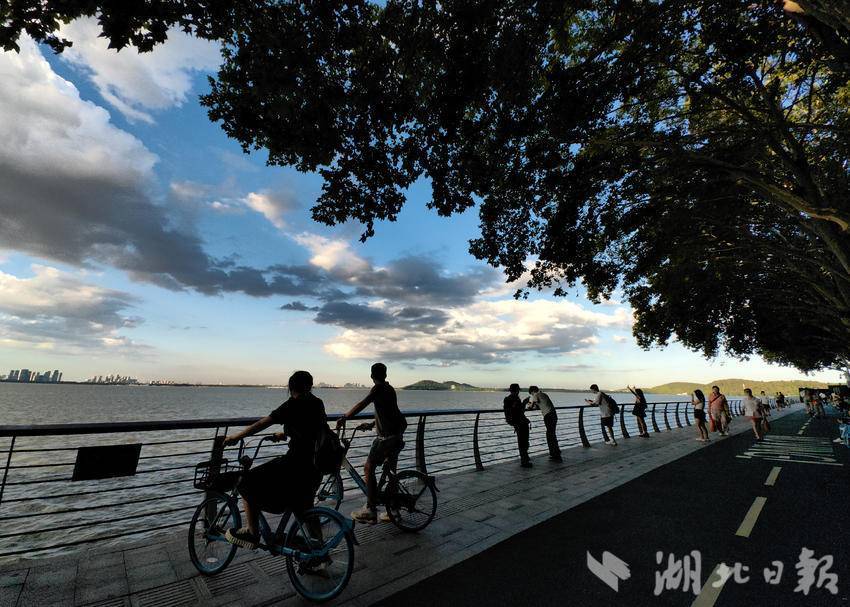 7月29日,游客在武汉东湖三期绿道欣赏沿线美景。台风“格美”过后,武汉天空中白云朵朵,傍晚时分的武汉大学凌波门栈桥处,众多市民在此嬉水消暑。武汉市气象台7月30日06时38分发布高温黄色预警信号:预计当日白天,武汉大部街道(乡镇)日最高气温将升至35℃以上,局地38℃以上。时值中伏,台风只是短暂“灭火”,晴热还将继续。本周,湖北省中东部晴热高温天气发展,最高气温将升至35℃-38℃,局地可达39℃-40℃。(湖北日报全媒记者 田悦 摄)