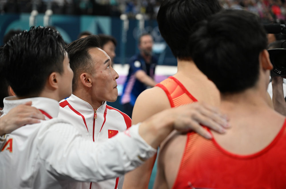 7月29日,中国队选手肖若腾(左二)与队友查看成绩。当日,在巴黎奥运会体操男子团体决赛中,中国队获得亚军。新华社记者 刘大伟 摄
