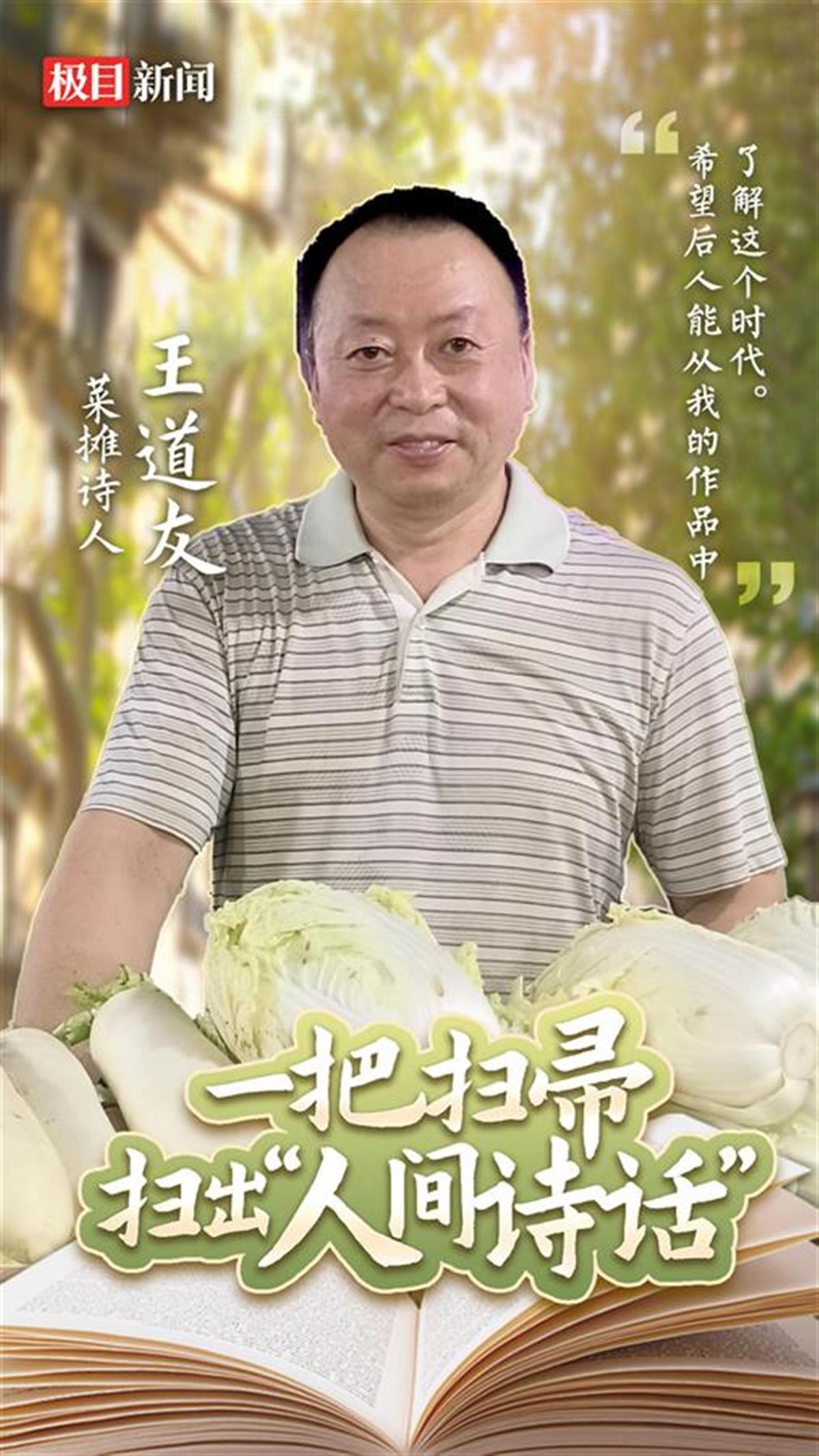 忙到中午,菜场里开始冷清下来,妻子回到附近的家中做饭,王道友可以打个盹。下午顾客不多,王道友守着摊子,脑海里开始琢磨诗句,摊子上的每一样蔬果都可以入诗。“风来满地香于蕊,雨过千丛体似酥”,写的是葱;“冰玉甘甜堪积冷,琼脂剔透自生凉”,指的是梨;“花缀满园黄玉斗,果成一地碧晶球”,形容的是西瓜……