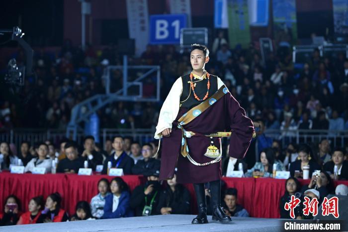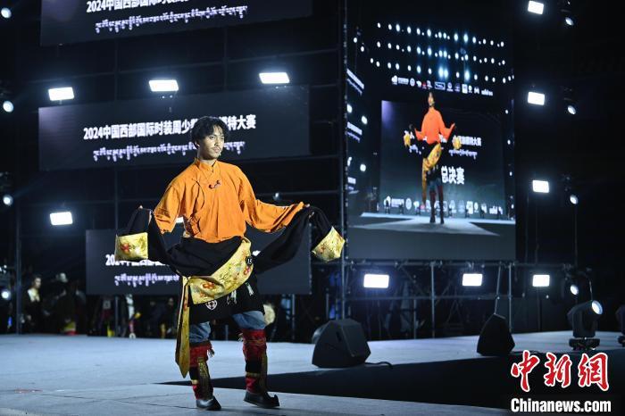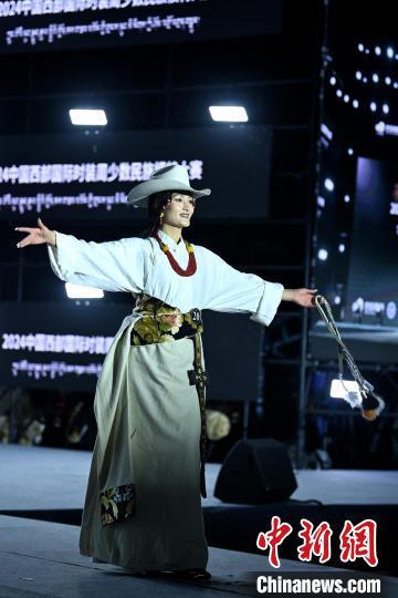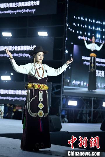 7月30日,2024中国西部国际时装周少数民族模特大赛全国总决赛在四川省甘孜藏族自治州理塘举行,来自四川、青海、西藏等5个省、自治区的31名模特参加决赛,经过激烈比拼,现场评出了冠亚季军、网络人气奖等奖项。图为比赛中的选手。中新社记者 刘忠俊 摄