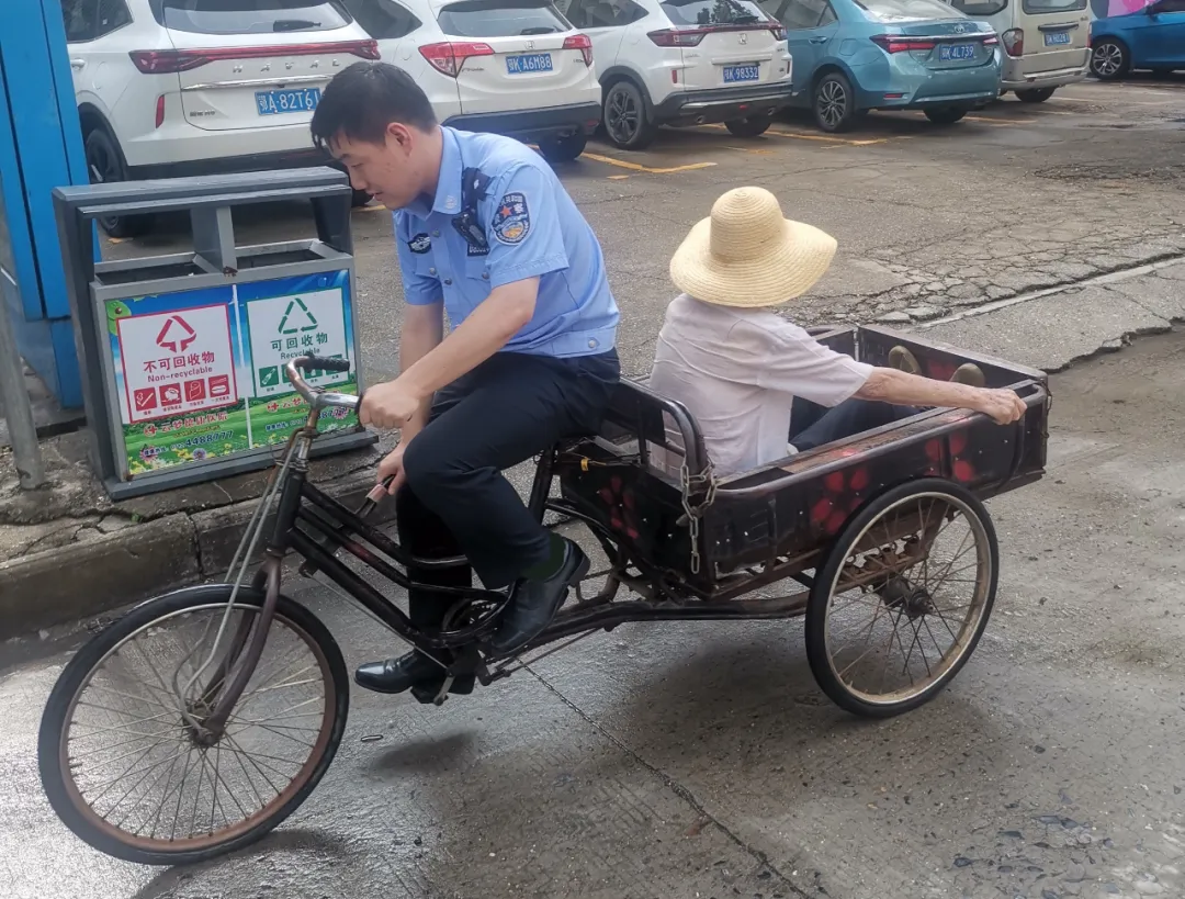 “大爷,您坐上来,我骑车送您回去!”面对这一情况,派出所新入职的民警程开主动提出,自己骑着老人的三轮车,将老人安全送回家。从发现老人到其家中,路程约3公里,程开足足骑行了20多分钟,最终平安抵达。