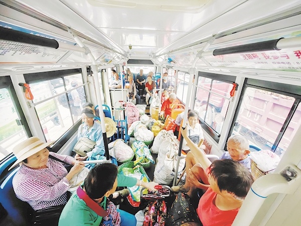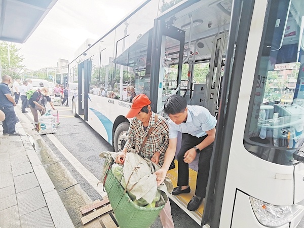 说话间,一辆J202路公交车稳稳停靠在菜农身边。司机胡四民打开车门后,与柯兵一前一后在两个车门维持秩序,帮大家把货物有序搬上车:“大家不要挤,车上位置很多……”“我帮你把篮子拎上去,你把扁担拿好……”两人相互配合,乘车秩序井井有条。很快,车厢的过道上就摆放了许多麻袋、小推车和菜篮。