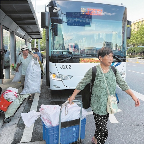“马上发车了,大家排好队。”J202路线长柯兵在站点维持秩序,菜农们纷纷挑起扁担做好上车准备。