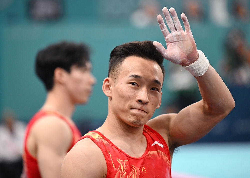 7月31日,中国选手张博恒在单杠比赛后等待成绩。新华社记者 曹灿 摄