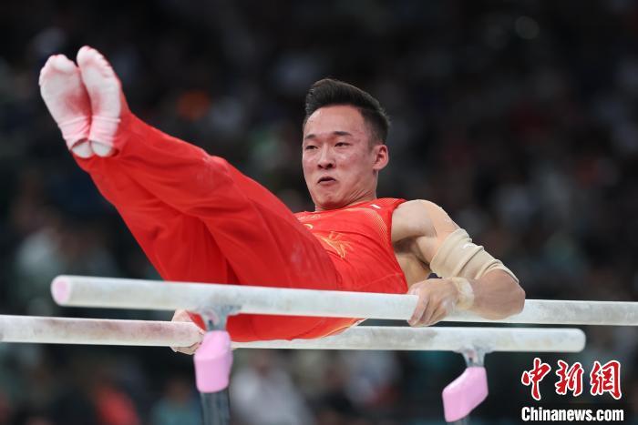 当地时间7月31日,在巴黎奥运会体操男子个人全能决赛中,中国选手张博恒获得银牌、肖若腾获得铜牌。图为张博恒在双杠比赛中。 中新社记者 盛佳鹏 摄