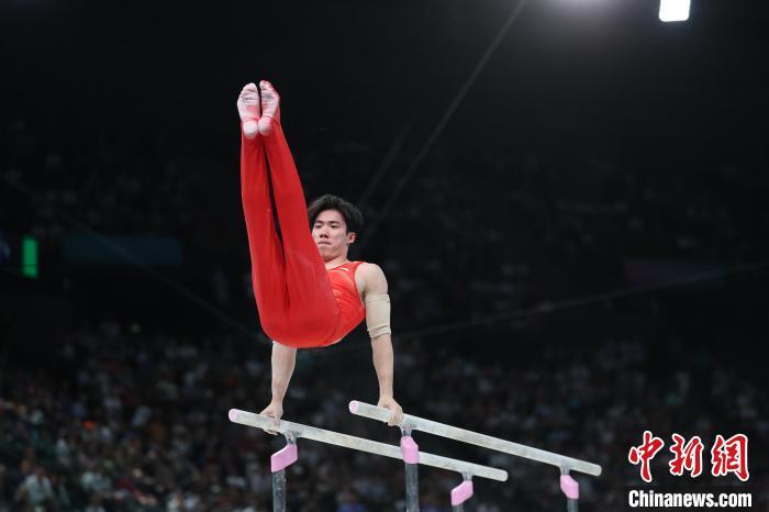 当地时间7月31日,在巴黎奥运会体操男子个人全能决赛中,中国选手张博恒获得银牌、肖若腾获得铜牌。图为肖若腾在双杠比赛中。 中新社记者 盛佳鹏 摄