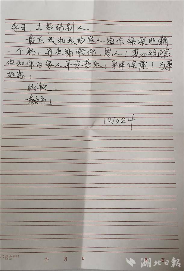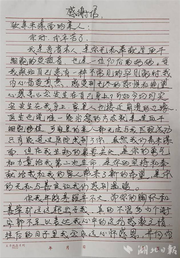 对于白血病患者小刘(化名)来说,是一个具有特殊意义的日子。这一天,她将接受造血干细胞的移植手术。她在感谢信里写道:“虽然我们素未谋面,但在我生病的紧要关头,是你的勇气和力量给了我第二次生命;是你的坚持和奉献给我和家人带来了新的希望;是你的无私与善良让我们感到温暖。”
