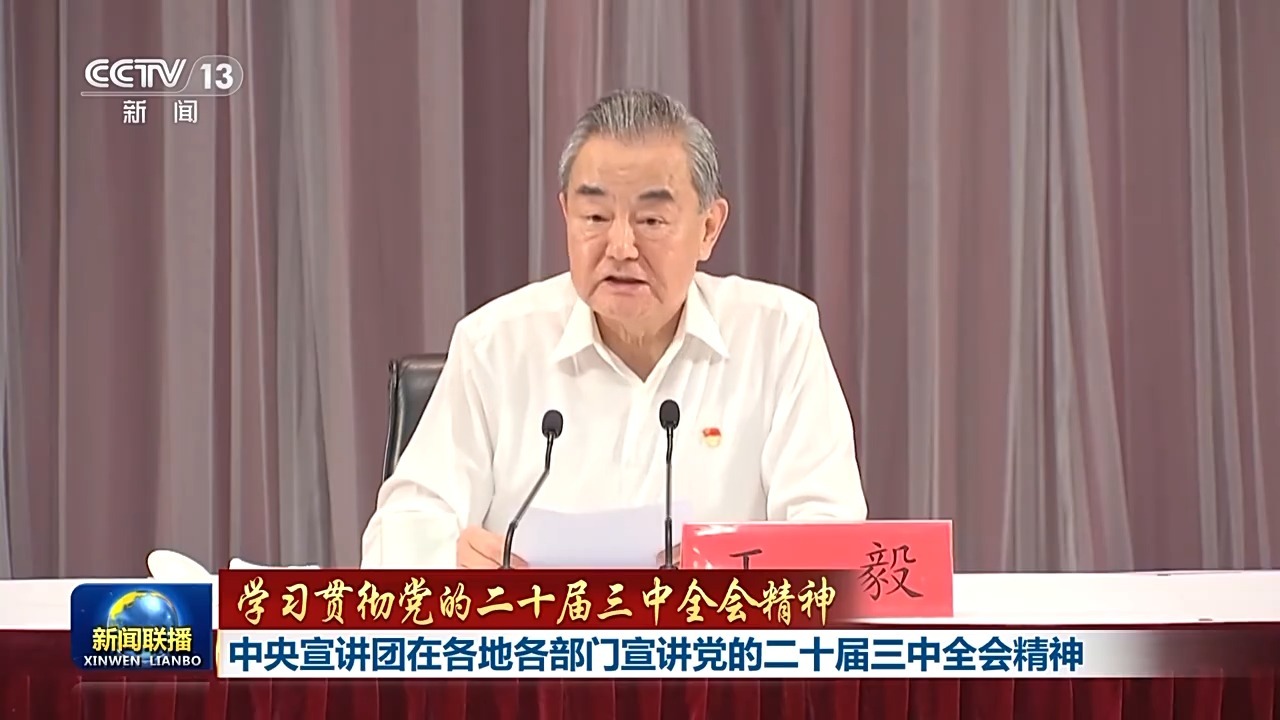 中央宣讲团成员、中共中央政治局委员、中央外办主任王毅7月31日在外交部作宣讲报告。王毅围绕深刻领悟党的二十届三中全会的重大意义、深入学习领会习近平总书记重要讲话精神、全面准确理解《决定》提出的进一步全面深化改革重大举措、全面认识把握全会对对外工作的战略部署和改革要求等方面进行系统阐释和深入解读。