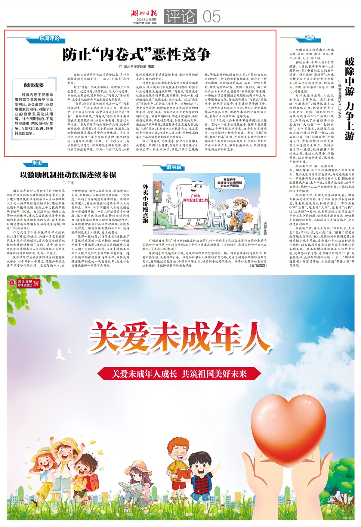 防止“内卷式”恶性竞争,强化行业自律至关重要。所谓行业自律,就是行业内的各方主体应当有一种基本共识,不能只顾自己赚快钱,僭越底线和红线自行其是,不管行业未来走向何方。行业内部的良性发展,理应是一种活水澎湃、创新涌动的局面,而非一种相互挤对、暗流涌动的状态。值得一提的是,由于新兴产业和未来产业显著的“身位优势”等原因,一些地方很容易因追求短期绩效而冲动上马,当警惕企业之间、行业内部滑向“内卷式”恶性竞争,避免盲目投资、重复建设等资源浪费。一个地方在谋划这些产业时,切忌只看重其优势而忽视其条件,需要从本地的比较优势出发,引导产业科学布局、有序发展。