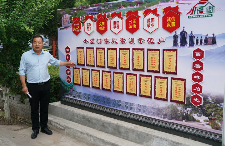 “耕读传家”“刚正可风”……行走在小强村,可以看到不同家庭的屏风墙或门楼前,都写着意蕴深长的家训。村入口处的巨石上,刻着一个大大的“孝”字。