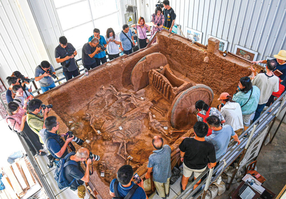 这是在陕西省考古研究院泾渭基地拍摄的西周晚期青铜轮牙马车。这套青铜轮牙马车2014年出土于陕西省宝鸡市岐山县周原遗址。新华社记者 李一博 摄
