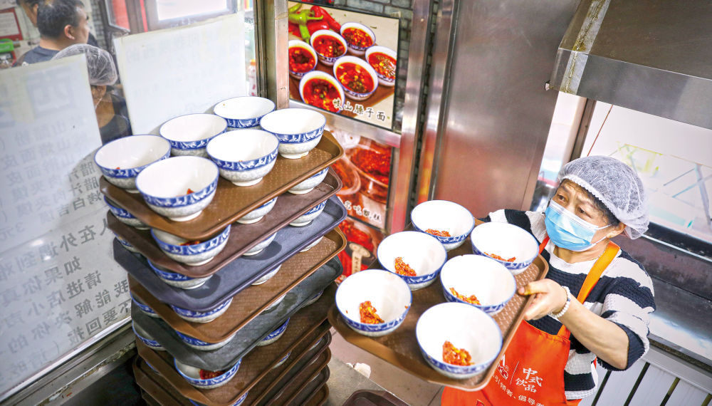 5月1日,一名服务员在后厨摆放好盛好臊子的面碗。新华社记者 姚剑锋 摄