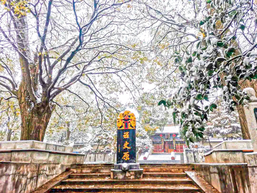 庭院中央,一座汉白玉雕像,头戴相帽,庄严慈祥——这正是周公雕像,往来游客纷纷拍照留影。