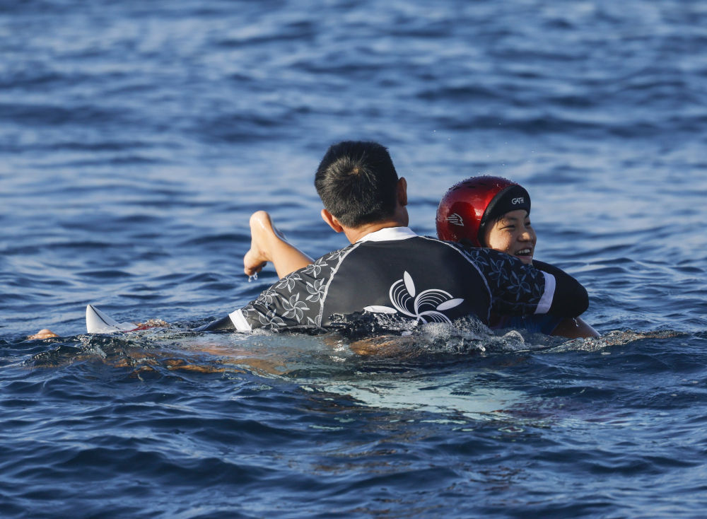 ↑中国选手杨思琪在比赛中乘坐摩托艇返回抓浪区域。