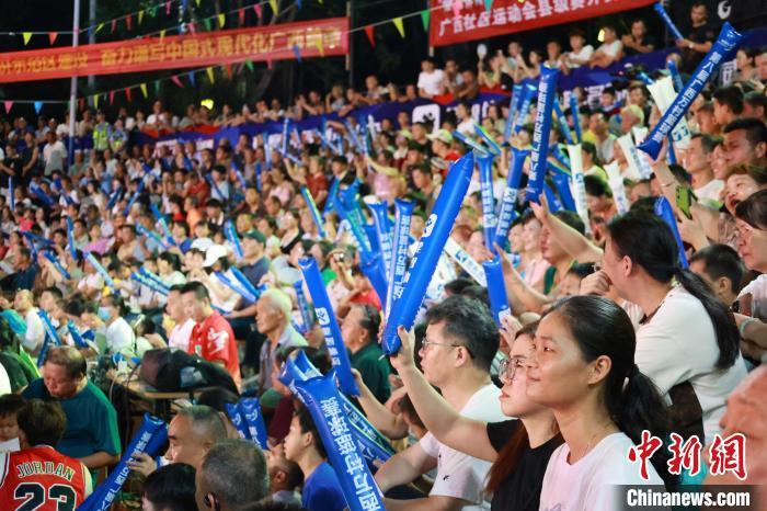 8月2日晚,第八届广西万村篮球赛县级赛开赛仪式在柳州举行。柳州鱼峰区球队与贵州台江县“村BA”球队同场竞技,中国篮球名宿王治郅为赛事开球。比赛中场休息环节,王治郅还与现场村民互动,进行趣味投篮PK等活动,再次点燃球场。图为观众观看“村BA”比赛。中新社记者 林馨 摄