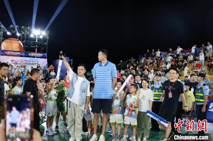 8月2日晚,第八届广西万村篮球赛县级赛开赛仪式在柳州举行。柳州鱼峰区球队与贵州台江县“村BA”球队同场竞技,中国篮球名宿王治郅为赛事开球。比赛中场休息环节,王治郅还与现场村民互动,进行趣味投篮PK等活动,再次点燃球场。图为王治郅与村民互动。中新社记者 林馨 摄