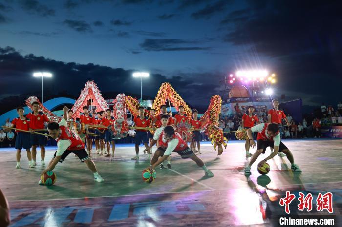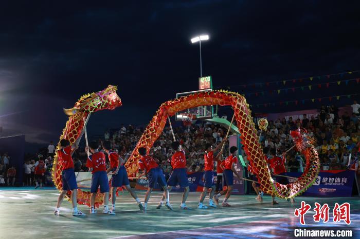 8月2日晚,第八届广西万村篮球赛县级赛开赛仪式在柳州举行。柳州鱼峰区球队与贵州台江县“村BA”球队同场竞技,中国篮球名宿王治郅为赛事开球。比赛中场休息环节,王治郅还与现场村民互动,进行趣味投篮PK等活动,再次点燃球场。图为开赛前表演。中新社记者 林馨 摄
