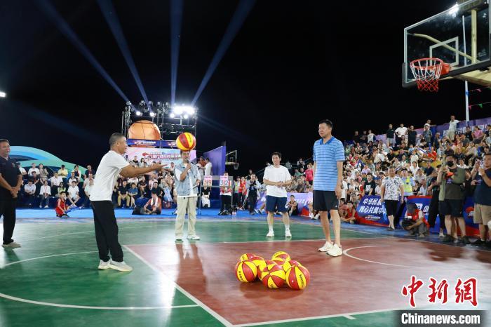 8月2日晚,第八届广西万村篮球赛县级赛开赛仪式在柳州举行。柳州鱼峰区球队与贵州台江县“村BA”球队同场竞技,中国篮球名宿王治郅为赛事开球。比赛中场休息环节,王治郅还与现场村民互动,进行趣味投篮PK等活动,再次点燃球场。图为王治郅为赛事开球。中新社记者 林馨 摄