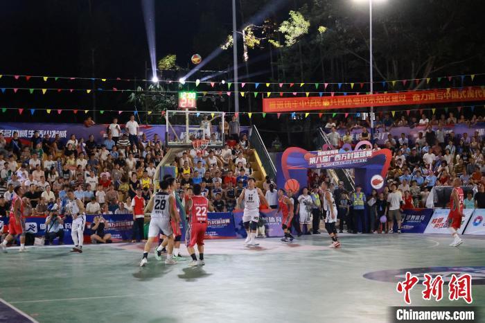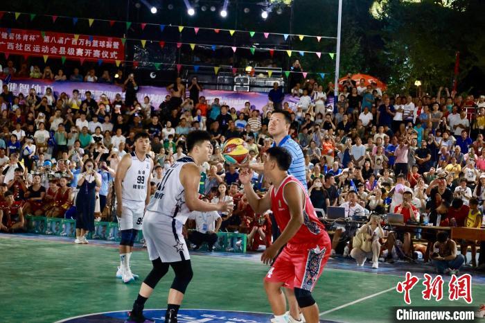 8月2日晚,第八届广西万村篮球赛县级赛开赛仪式在柳州举行。柳州鱼峰区球队与贵州台江县“村BA”球队同场竞技,中国篮球名宿王治郅为赛事开球。比赛中场休息环节,王治郅还与现场村民互动,进行趣味投篮PK等活动,再次点燃球场。图为比赛现场。中新社记者 林馨 摄