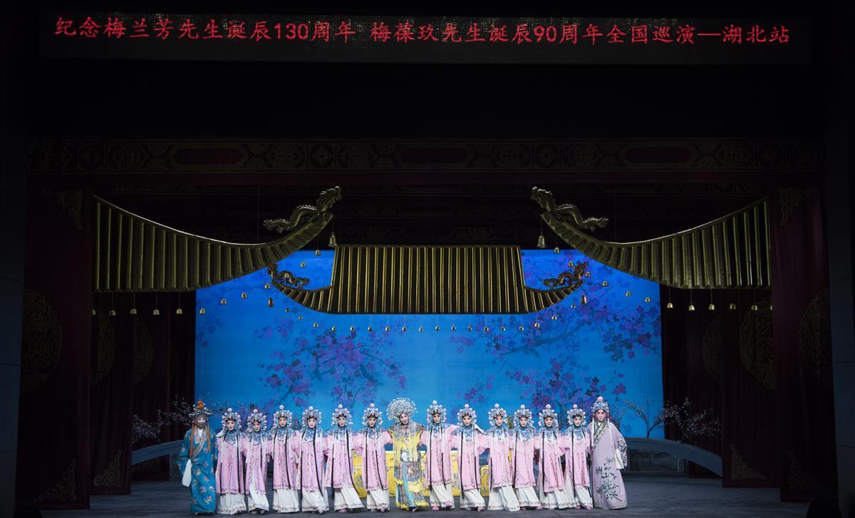 当晚,由北京京剧院与湖北省京剧院联合主办的纪念京剧艺术大师梅兰芳先生诞辰130 周年、梅葆玖先生诞辰90 周年的“梅韵流芳”系列演出拉开大幕,抢先登场的《梅华香韵》齐集《贵妃醉酒》《霸王别姬》《黛玉葬花》《廉锦枫》《天女散花》等多个梅派经典选段,由国家一级演员、“梅派”第三代传人胡文阁领衔的艺术家阵容,凭借每一个精彩的亮相、每一句婉转的唱腔收获了全场观众的叫好与掌声。
