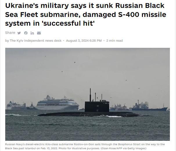 中新网8月4日电 据《基辅独立报》报道,当地时间8月3日,乌克兰军方发表声明称,2日,乌军发射导弹袭击了克里米亚地区,击沉了一艘俄罗斯黑海舰队潜艇,并使俄军S-400防空系统遭到破坏。