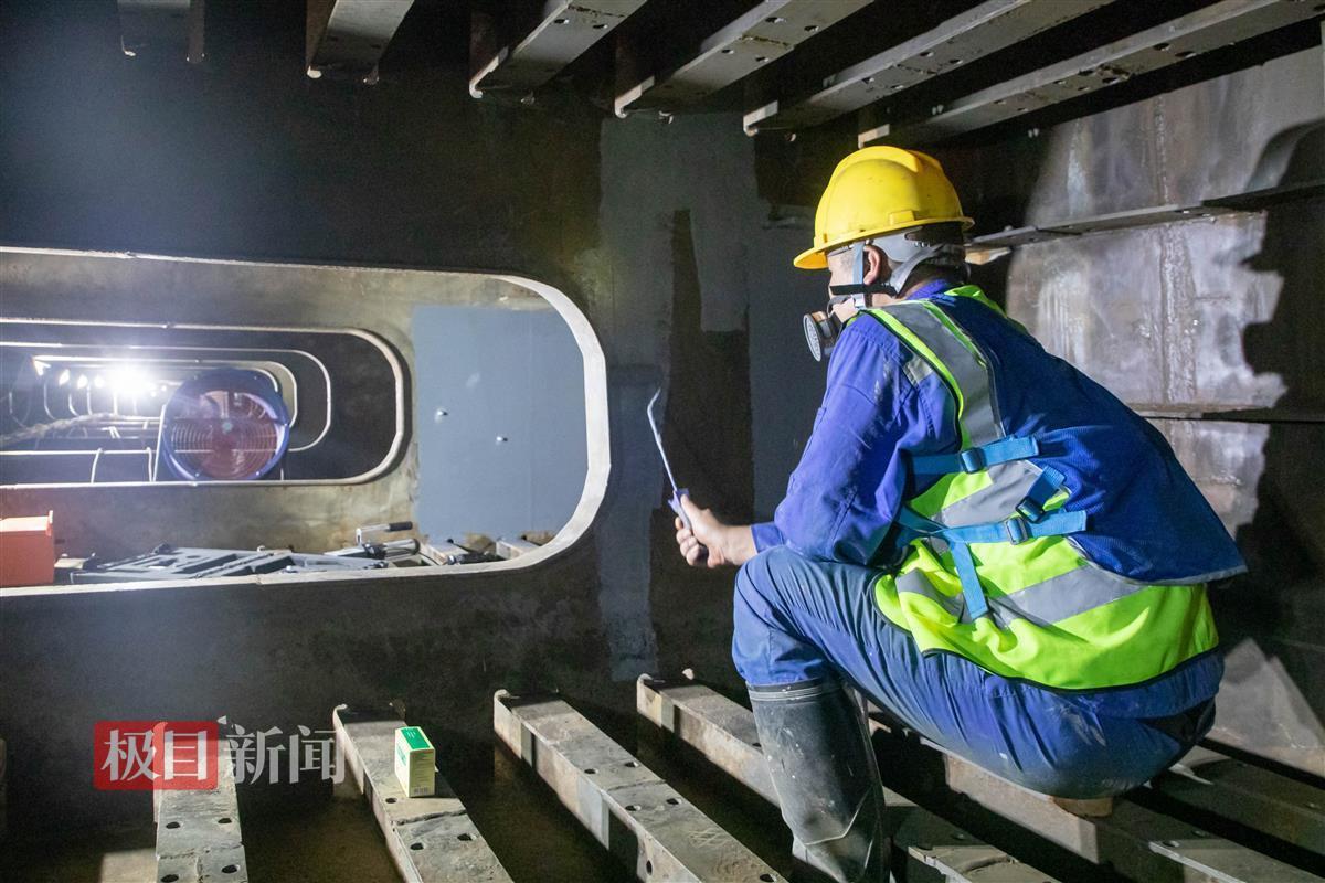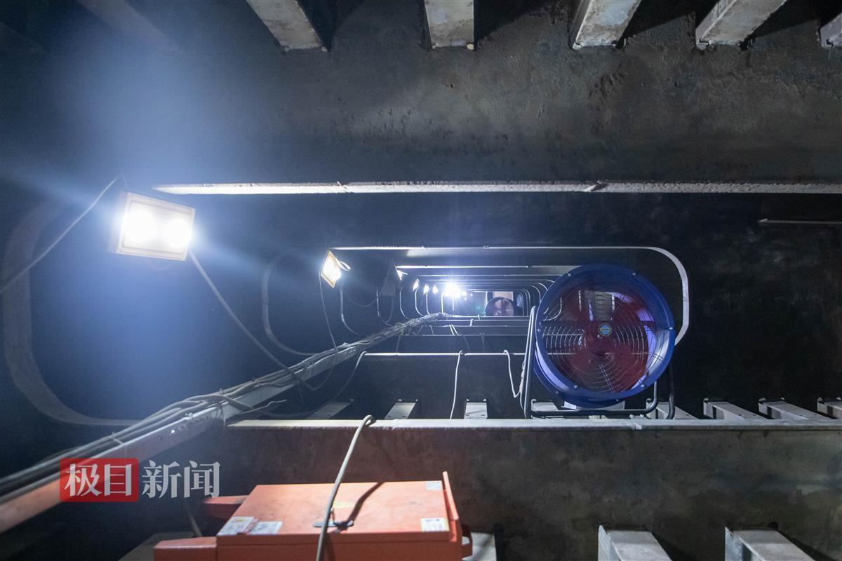 道桥工人在钢箱梁内部挑灯维修