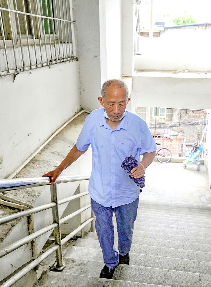 80岁的吴天祥爬楼梯走访受助者家庭