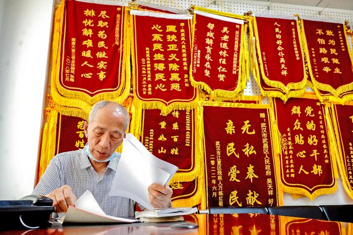 近日,记者来到武昌区信访局吴天祥的办公室,几千封感谢信和500多面锦旗,都是他对困难群众的爱的见证。