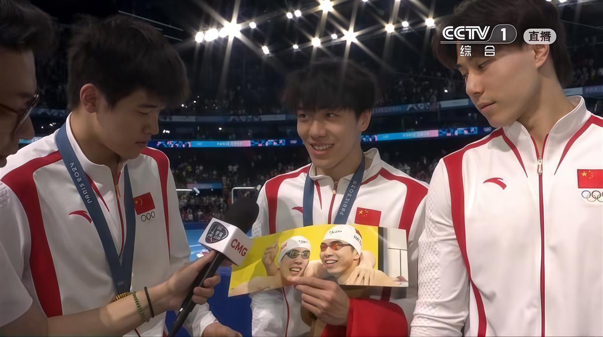 夺冠后,孙佳俊(中)接受媒体采访时,带着师兄妹的海报(图源:央视频)