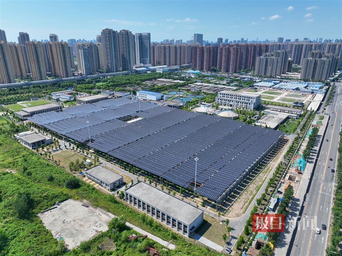 8月5日,俯瞰位于武汉市洪山区张家湾街道的黄家湖污水处理厂,相当于7个足球场面积的光伏发电板紧密排列,覆盖地面上的污水处理池。