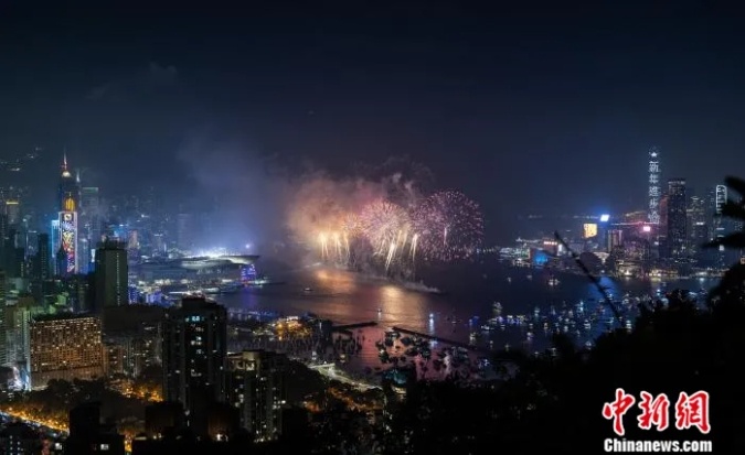 1月1日零时许,从香港宝马山红香炉峰远眺在维多利亚港举行的“跨年倒数烟花音乐汇演”。中新社记者 侯宇 摄