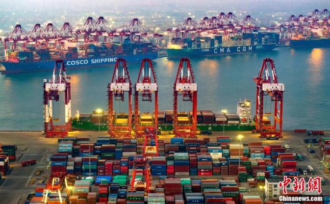 山东港口青岛港前湾集装箱码头泊位饱满,集装箱装卸繁忙有序。韩加君 摄