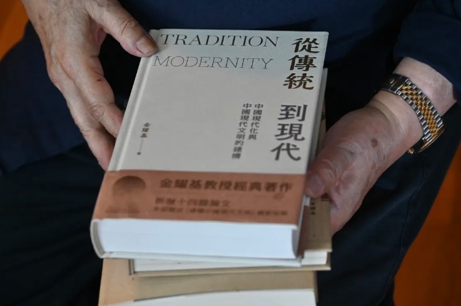 金耀基手持其著作《从传统到现代:中国现代化与中国现代文明的构建》。中新社记者 李志华 摄