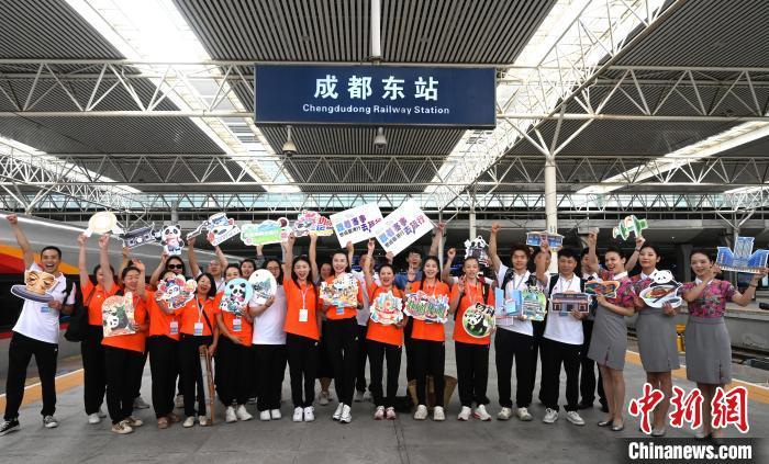 8月6日,“世运蓉港行”主题列车(G2963成都东站——香港西九龙站)从成都火车站东站发车启程,搭乘首发列车的嘉宾在出发前合影留念。 中新社记者 安源 摄