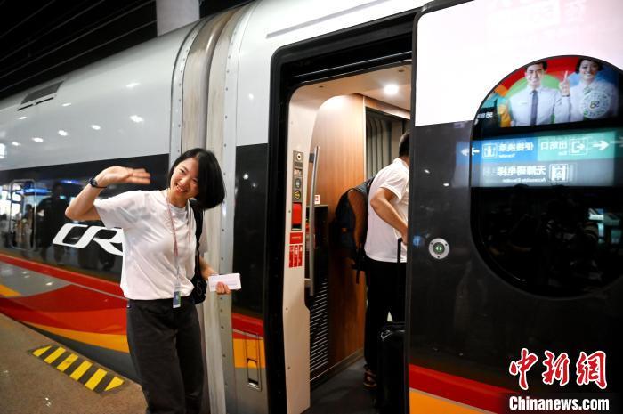 8月6日,“世运蓉港行”主题列车(G2963成都东站——香港西九龙站)从成都火车站东站发车启程,旅客搭乘首发列车。 中新社记者 安源 摄